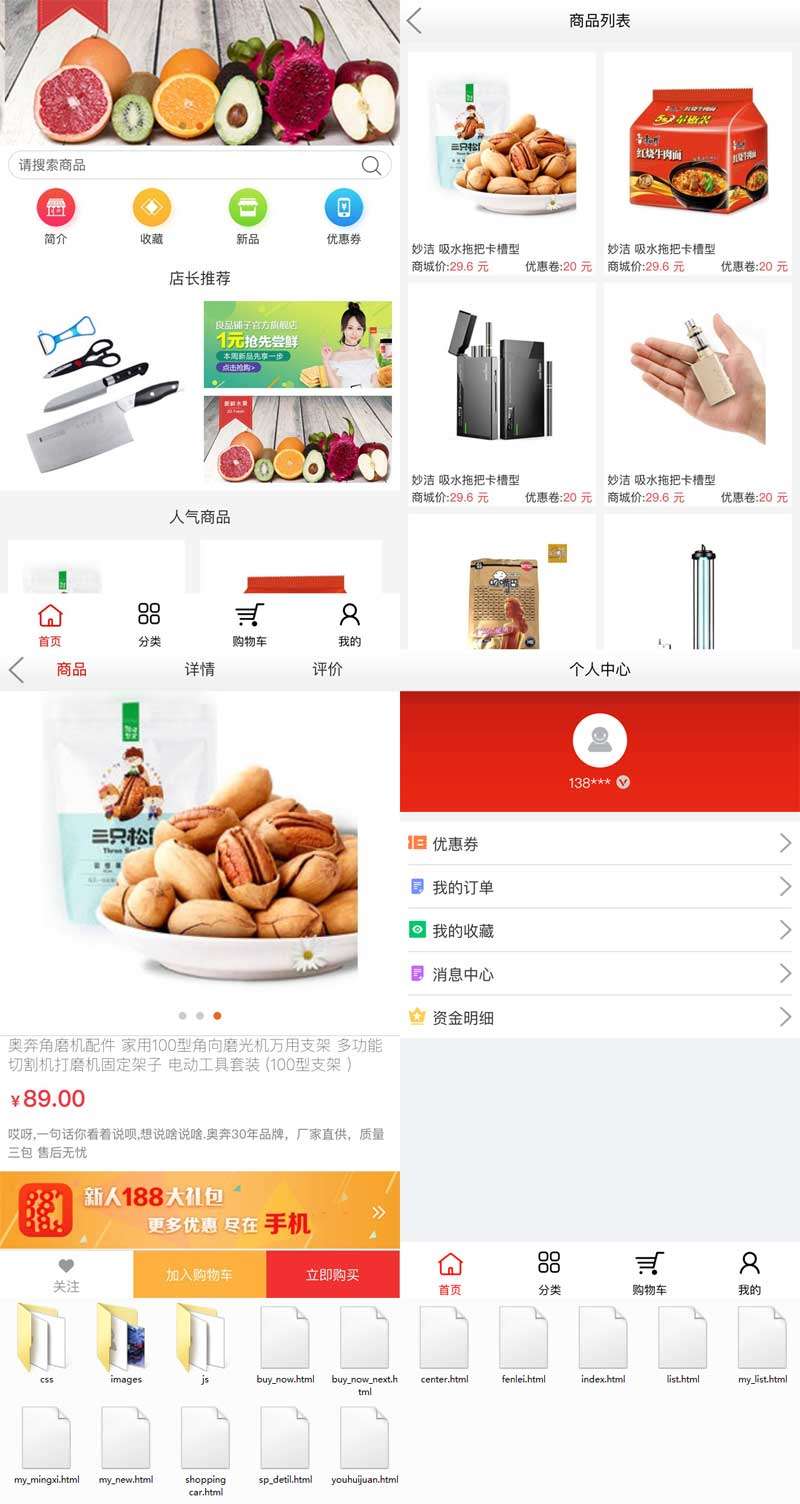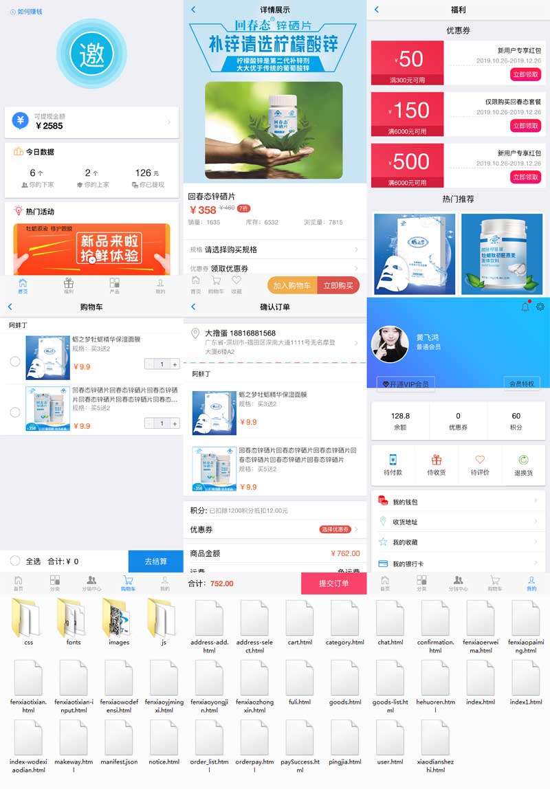 社交新零售手机端app商城页面模板,可用于小程序,APP。包括首页,个人中心,商品列表,商品详情页,购物车,订单列表等30个页面。...