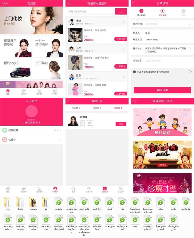 红色的美到家化妆造型o2o平台手机端HTML网站模板。化妆造型服务手机模板下载。主要页面有:手机绑定、化妆师 - 预约、新娘化妆师、我要美发、美发 - 列表、明星御用造型、妆容 - 预约、妆容 - 新娘妆简介、个人中心、新增地址、地址列表、我的收藏、我的优惠...