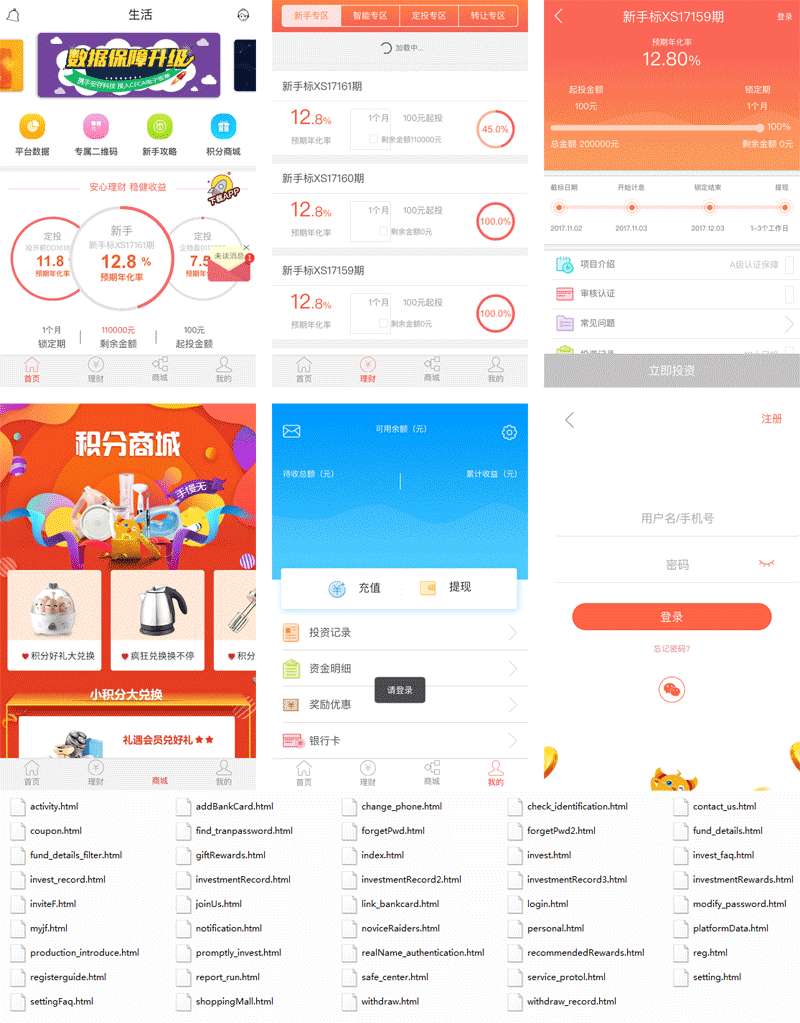 橙色的P2P个人理财平台app手机网站模板、互联网金融平台app,个人投资理财app,小额投资理财手机模板。主要页面有:理财产品、产品详情页、积分商城、个人中心、安全中心、登录、注册、忘记密码、消息中心、新手攻略、可用余额、充值提现等全套手机理财app网页...