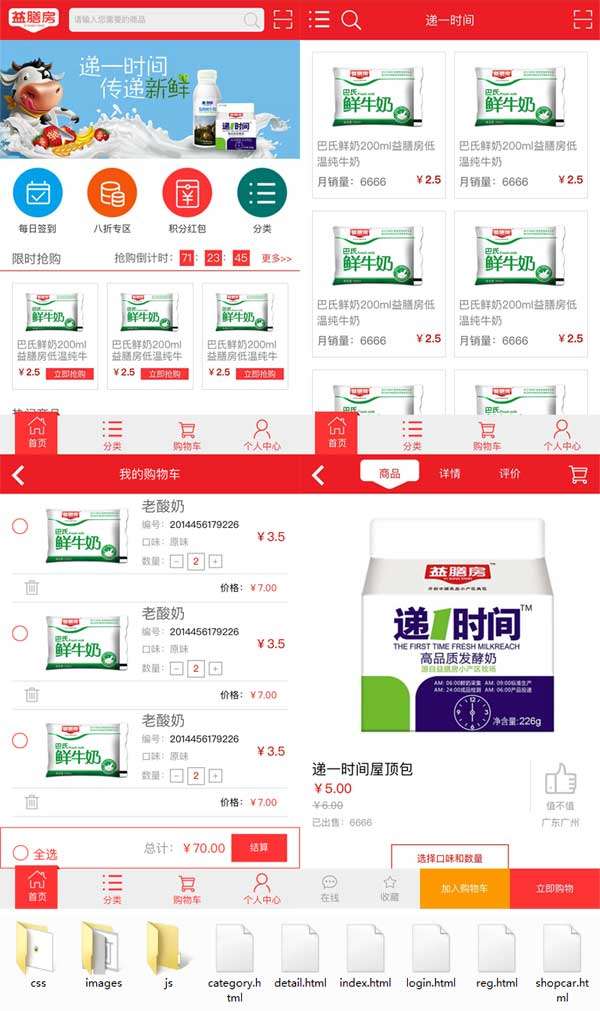 红色的牛奶商城手机wap模板、益膳房官网手机模板、分类页面、登录页面、注册页面、购物车结算页面、商品详情页面模板。总共:6个页面。...