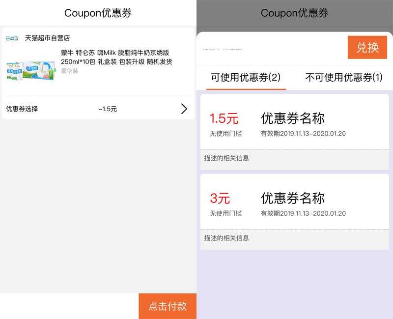 手机端优惠券点击使用效果,通用的商城优惠券选择兑换点击付款手机页面模板。(vue.js+js+html+css)...