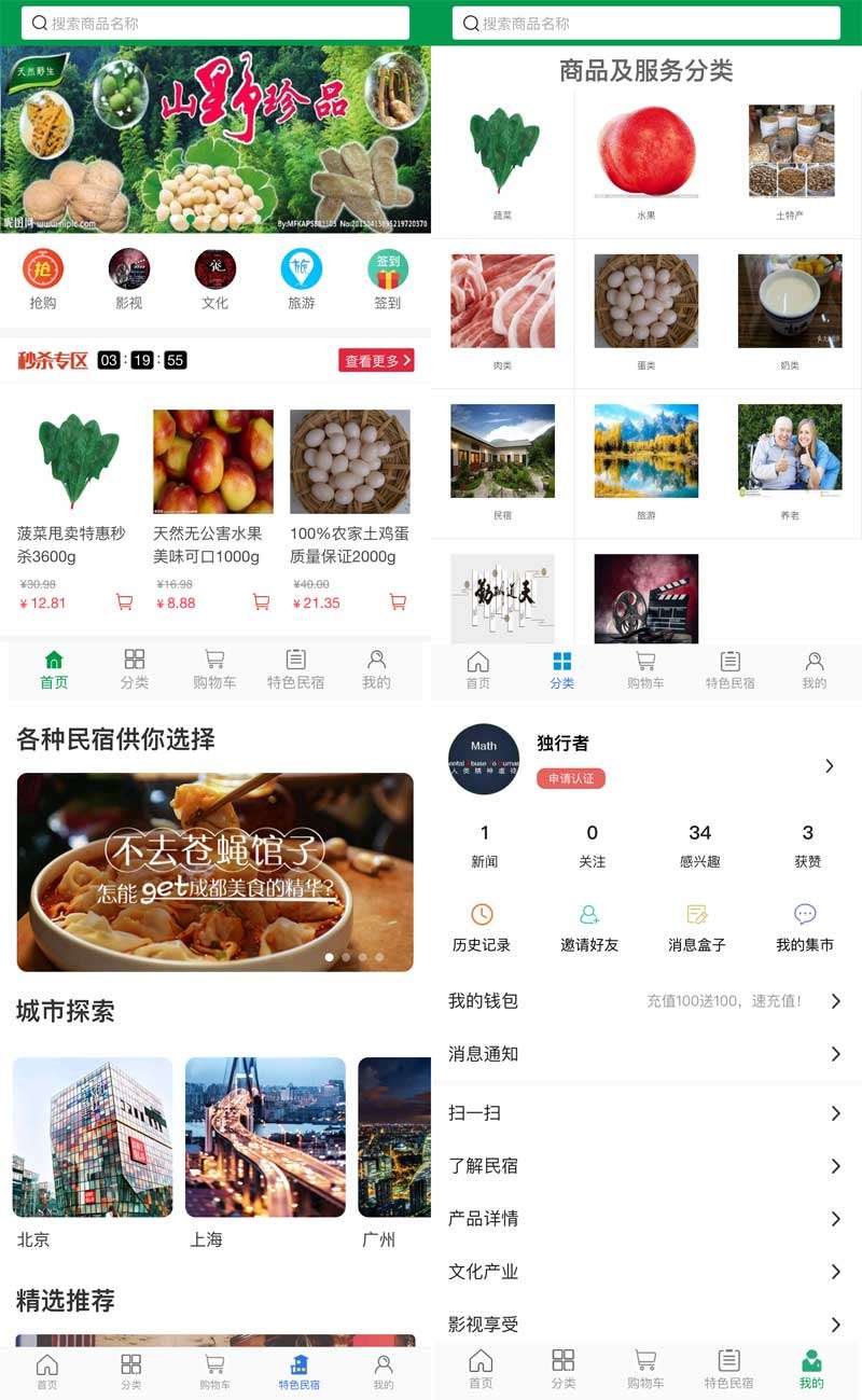 一款实用的农产品分类购物商城手机APP模板,包含:主页、商品分类、购物车、特色名宿、我的中心等总共7个手机页面。全部是用原生写的,希望对你有所帮助。...