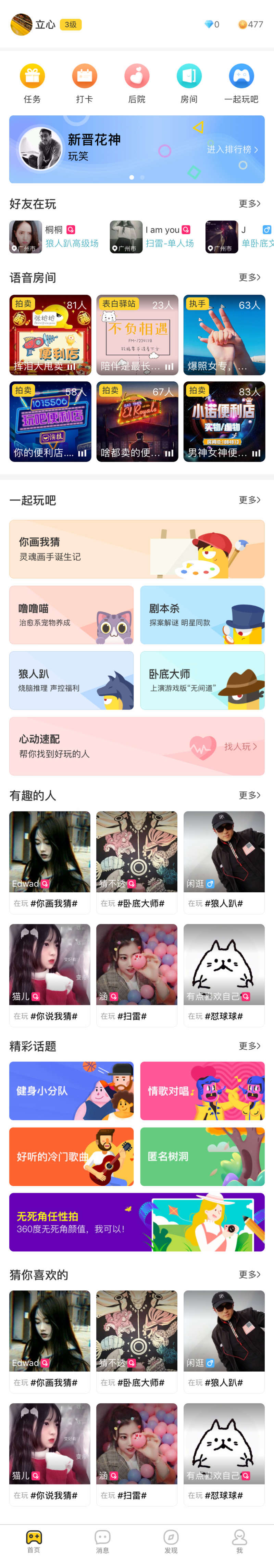 爱玩社交应用娱乐平台手机app页面模板。任务、打卡、后院、房间、玩吧、好友在玩、语音房间、一起玩吧、有趣的人、精彩话题、猜你喜欢的等。...