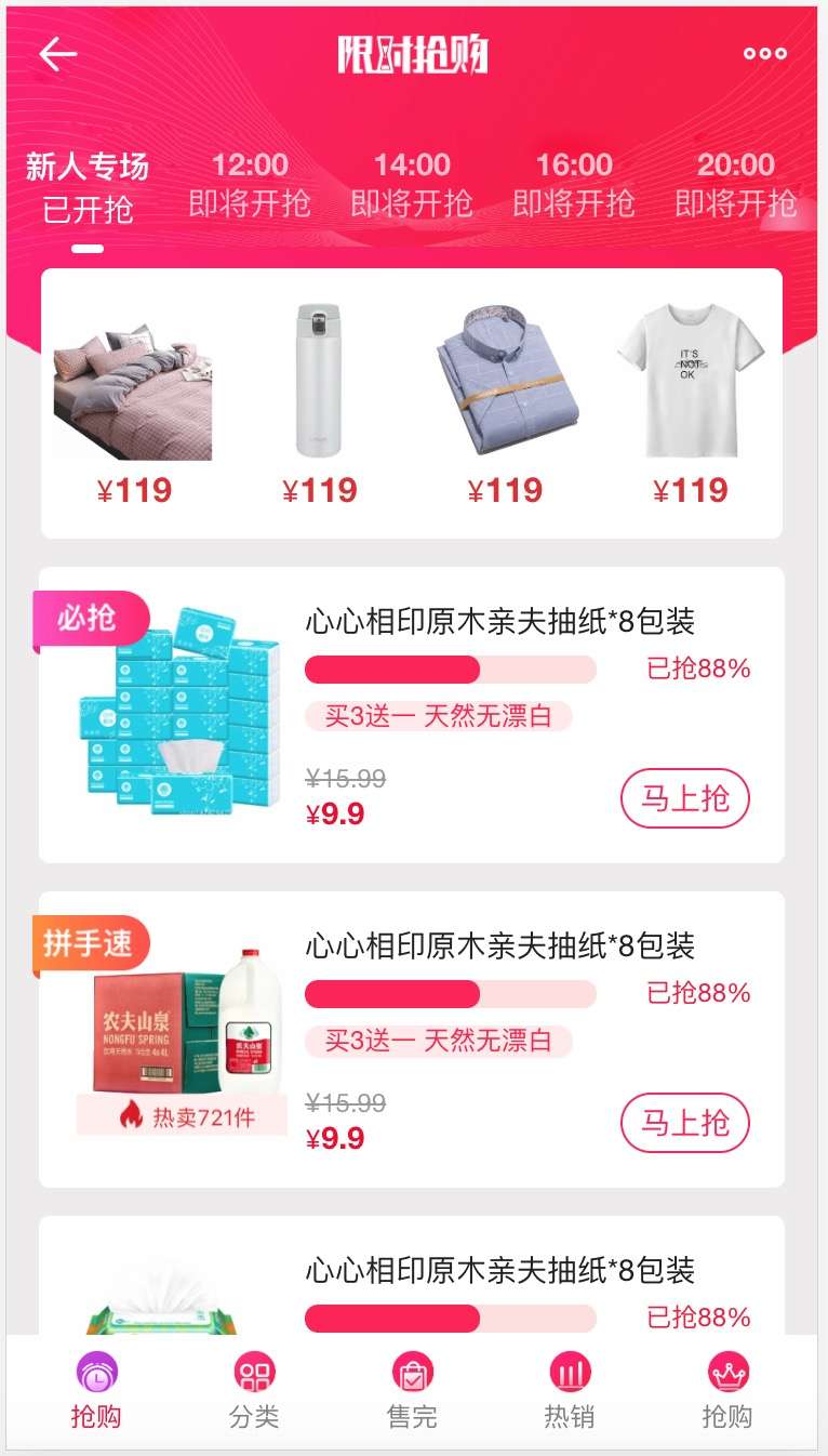 手机app通用模板商城购物限时抢购列表页面模板。倒计时开抢,品牌抢购手机页面。...