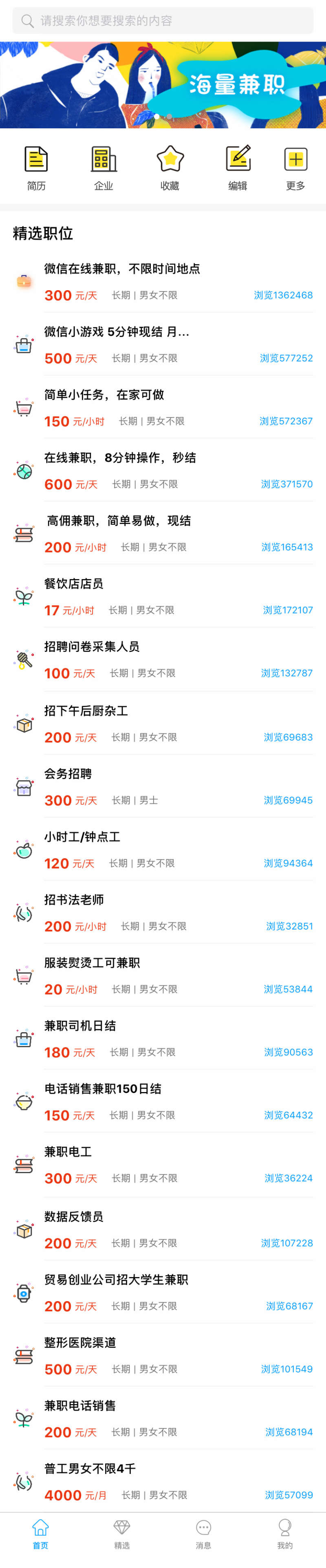 简单实用的海量兼职网app找工作招聘首页模板。简历、企业、收藏、编辑、更多、精选职位等。...