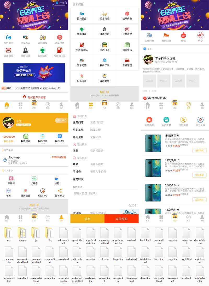 手机app汽车商城,综合服务,在线咨询,汽车综合服务平台页面模板。主要有:预约服务、汽车问答、紧急救援、违章代缴、优惠商城、维修技师、智能询价、附近加油站等总共41个页面html下载。...