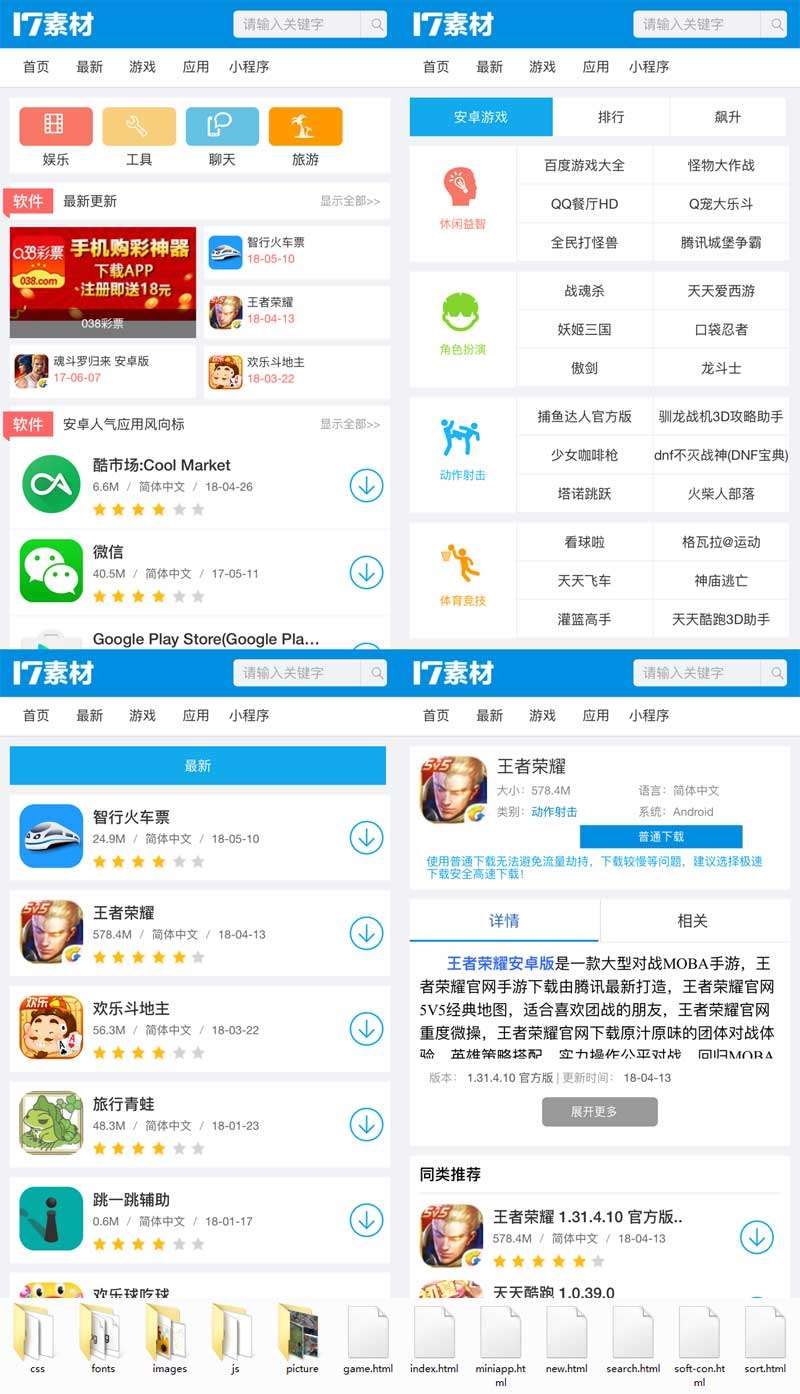 蓝色的手机app软件下载官网模板,app应用软件下载中心手机模板。主要页面有:软件列表页面、详情页、软件分类页面、软件新闻资讯、搜索页面等总共7个手机页面。...