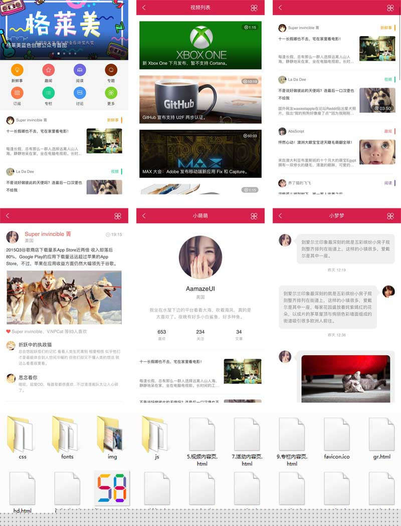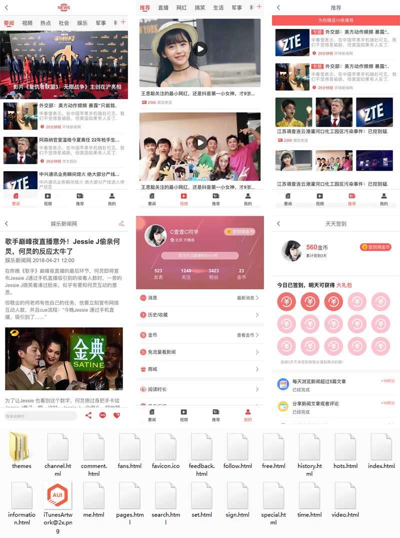 娱乐心知app新闻网:aap新闻资讯html5源码,红色系列原创设计:包含,首页,要闻页面,视频页面,个人中心页面,新闻资讯详情页面,个人中心,包含了了,我的消息,订阅,收藏,跟帖,阅读,动态,离线阅读,积分商城,意见反馈,粉丝,关注,以及订阅公众号...