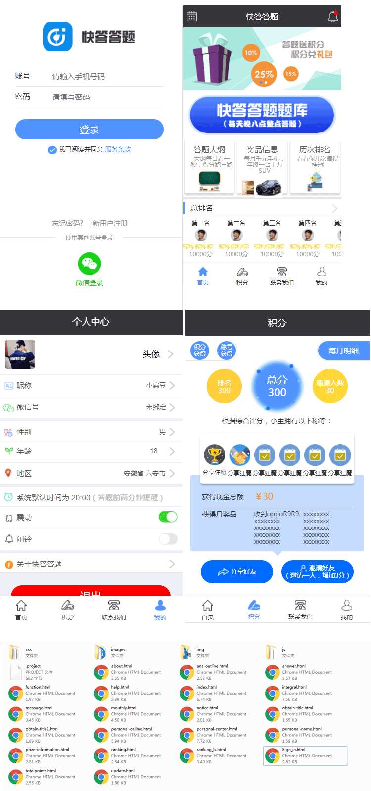 快问快答手机app软件模板,答题app页面模板、源码、蓝色风格、个人中心、登录、首页、积分、详情页、好友分享功能、手机积分商城功能页面模板html源码下载...