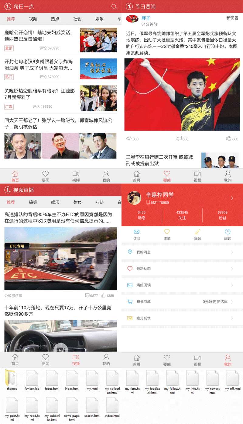 每日一点:aap新闻资讯html5源码,红色系列原创设计:包含,首页,要闻页面,视频页面,个人中心页面,新闻资讯详情页面,个人中心,包含了了,我的消息,订阅,收藏,跟帖,阅读,动态,离线阅读,积分商城,意见反馈,粉丝,关注,以及订阅公众号,等等相...