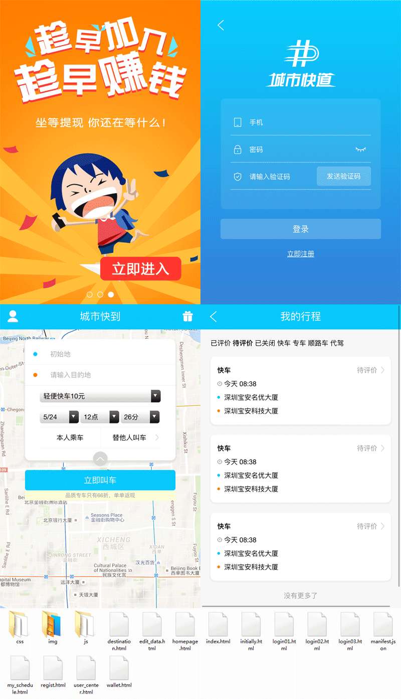 手机APP网站,城市快道app界面模板,我的行程、注册、登录、打车界面等手机页面模板下载。...