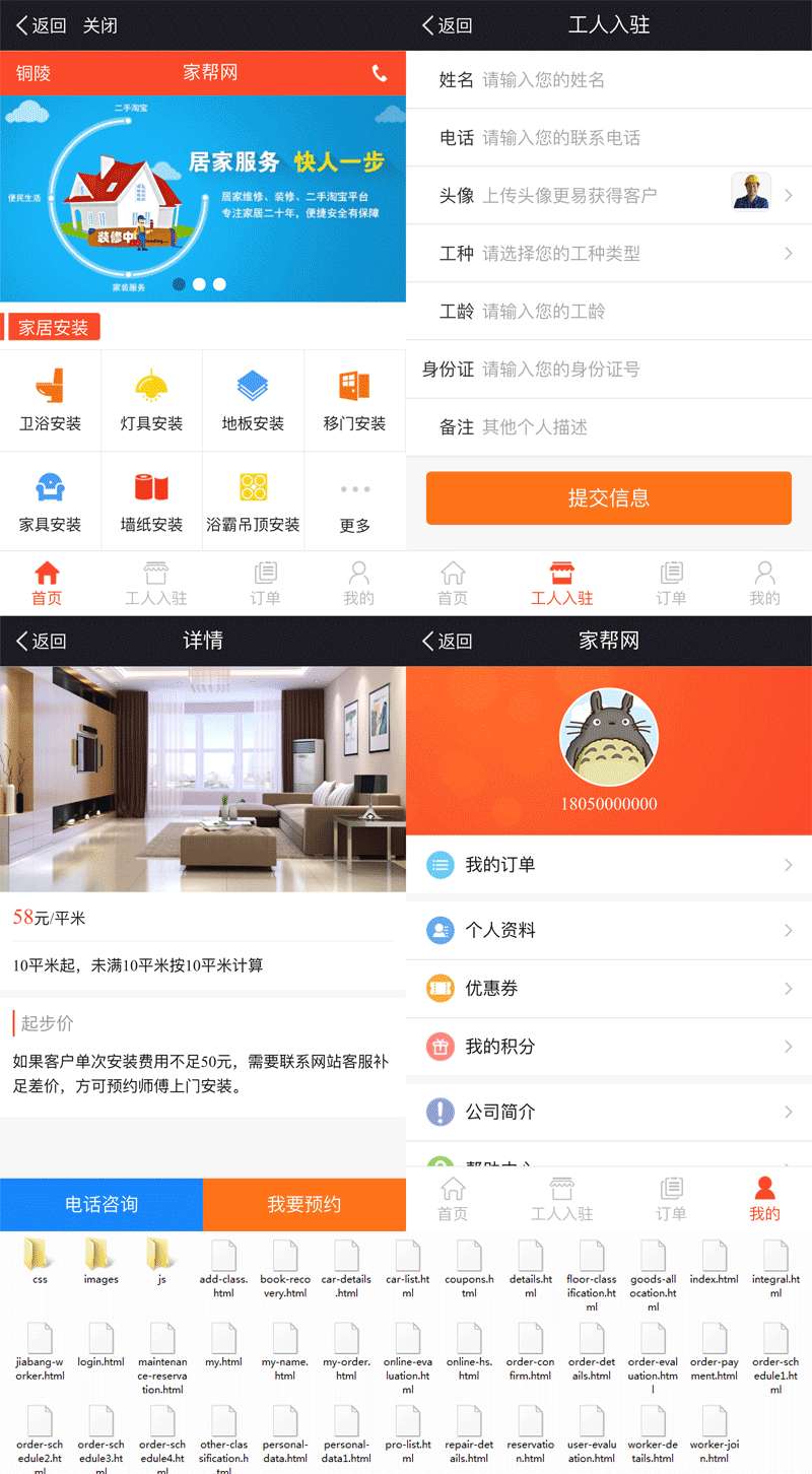 装修选择网手机网站HTML5整站源码,现场增项、预约回收、装修详情、小型面包车、我的优惠券、选择地板品类、货运配送、积分、家帮师傅、登录、我要预约、家帮网、我的订单等手机app模板下载。总共:35个页面模板...