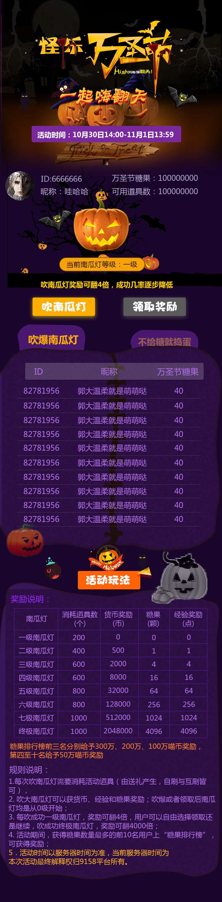 卡通的万圣节吹南瓜灯的活动页模板,可用于充值活动手机页面模板。游戏规则:1、每次吹南瓜灯需要消耗活动道具,吹爆或者领取后南瓜灯均是从0级开始;2、吹大南瓜灯可以获货币、经验和糖果奖励; 3、每吹成功一级南瓜灯,奖励可翻4倍,用户可以自由选择领取...