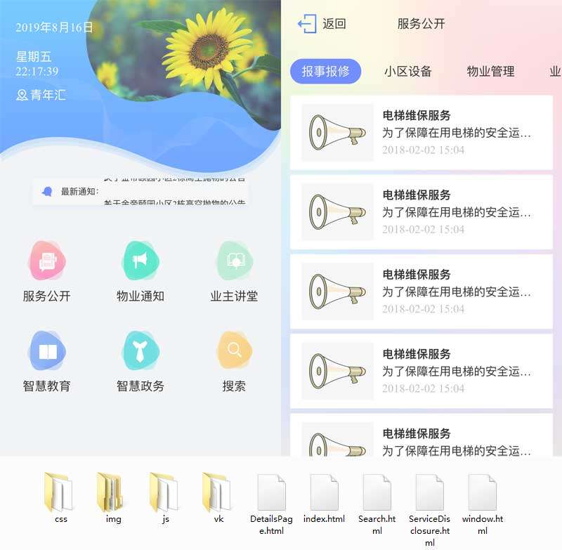 简单实用的生活服务,物业通知,业主讲堂,智慧教育,智慧政务手机页面模板。 ps:请运行window.html 用于模拟竖着的大屏。...