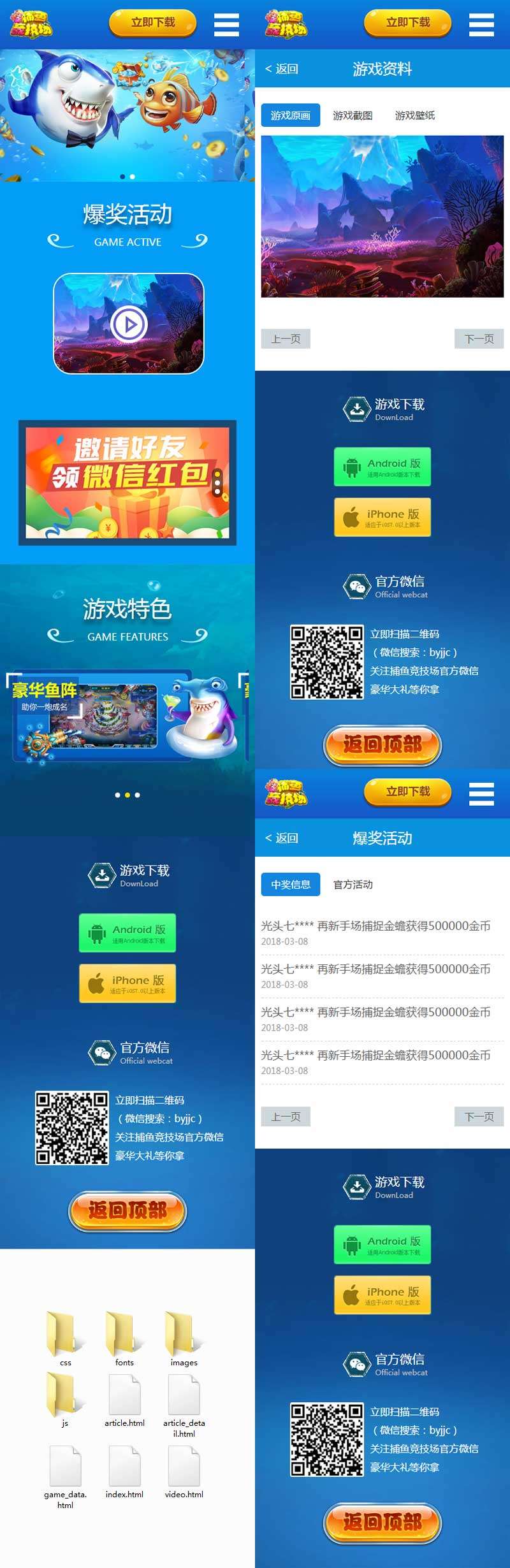 蓝色手机端的捕鱼游戏官方网站模板html下载。主要有:视频列表、文章列表、文章详情、游戏资料等5个手机游戏页面。...