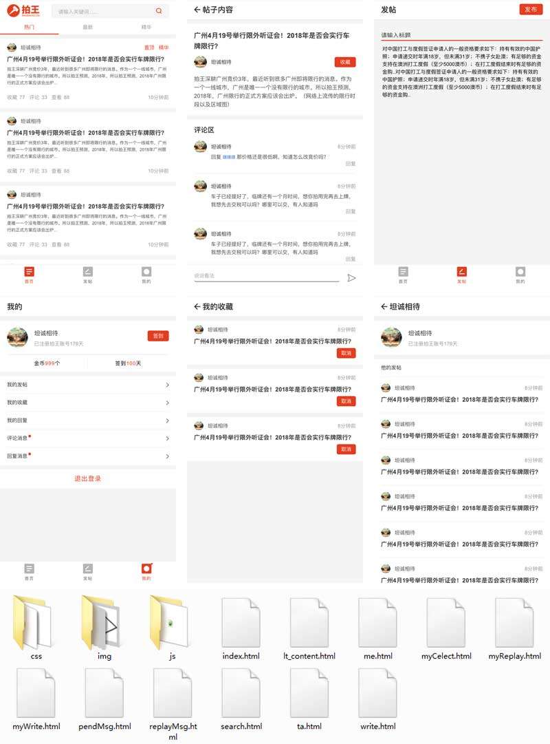移动端的车牌竞拍论坛社区网站模板。拍王app手机页面模板html下载。主要有:帖子内容、发帖页面、个人中心、我的收藏、坦诚相待、评论消息等总共11个页面。...