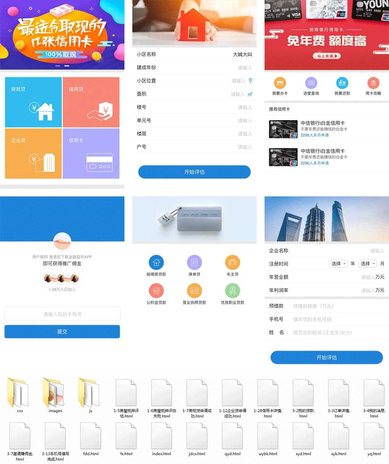 (原创设计)简单的金融贷款业务手机app网站模板,银行房屋贷款手机网站模板html源码。房屋抵押贷款,房屋抵押评估,房屋抵押评估失败,房抵贷申请成功,企业大额贷款,企业贷申请成功,信用贷款,信用卡,我要办卡,信用卡详情,进度查询,我的贷款,订单详...