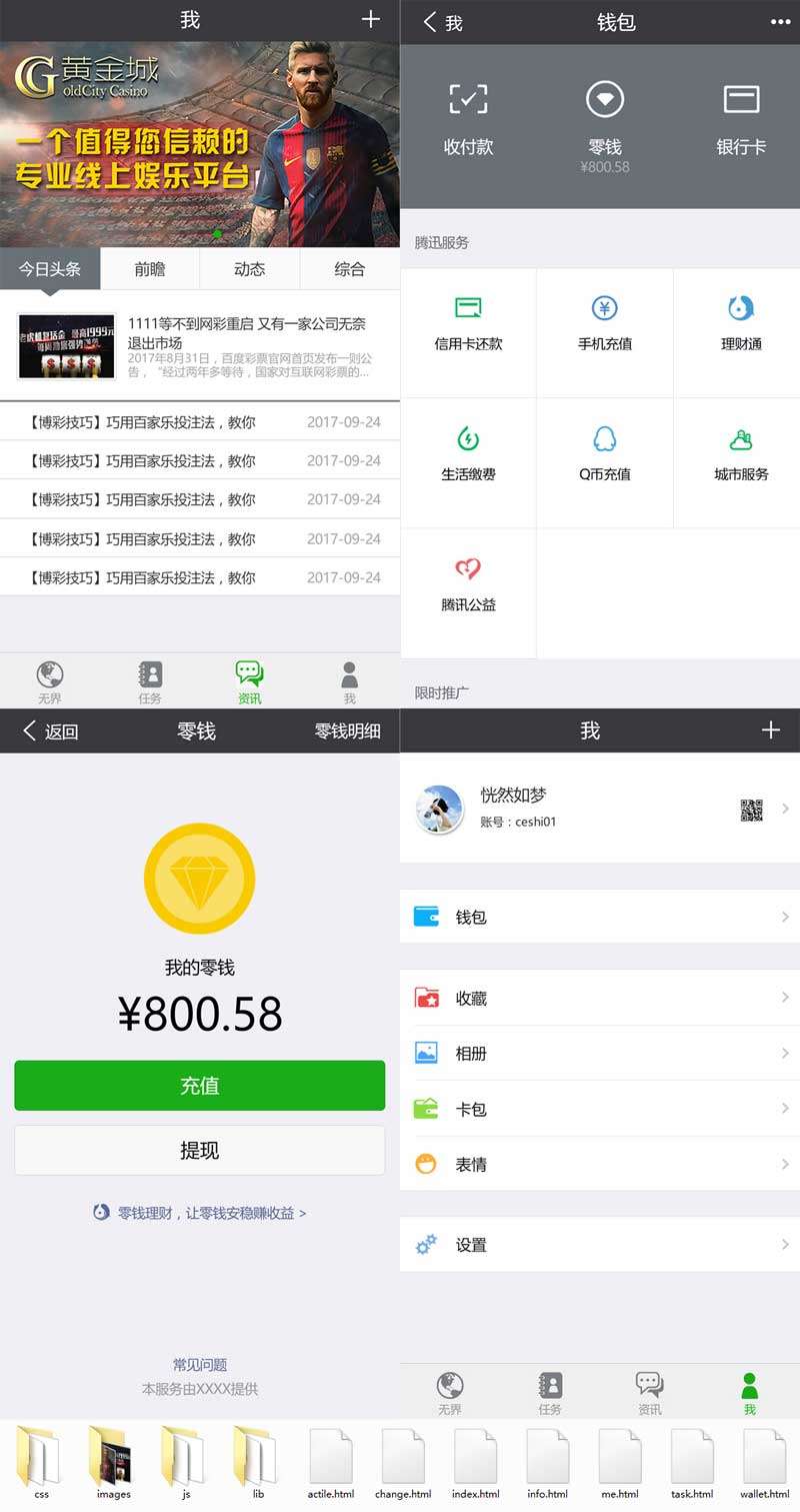 移动端仿微信个人中心手机页面模板包含:文章页,首页,详情页,钱包,个人中心等微信功能页面模板html源码下载。...