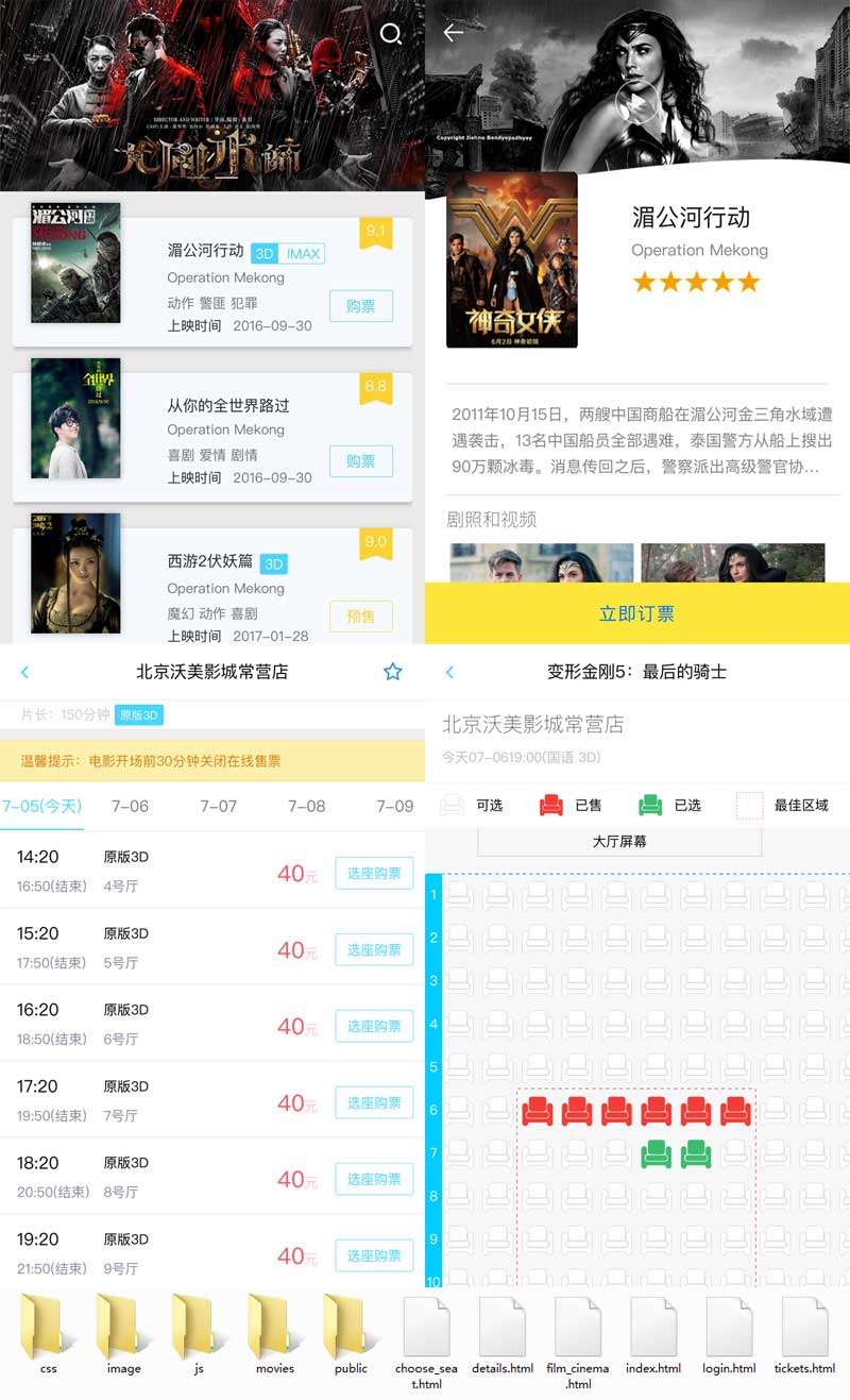 电影院售票选座系统界面html下载,电影票选座页面、电影票订购页面、电影院列表页面、电影票时间段选择页面等电影票选座界面模板。...