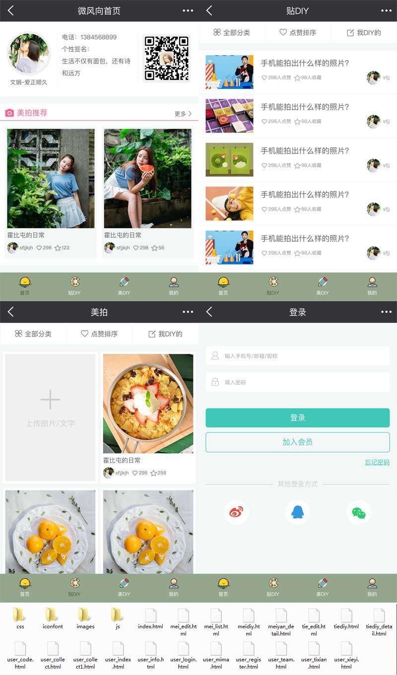 微风向首页、贴DIY、贴DIY详情、美DIY、登录、会员中心、个人资料、我的团队、我的收藏、我的二维码等美拍生活类博客网站手机模板html全套源码...