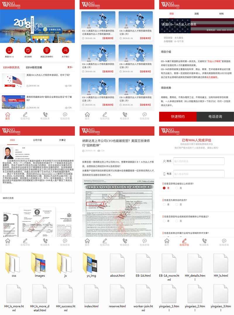 红色实用的美国移民网站手机端模板,国外签证移民手机模板下载。主要有:关于我们、移民项目流程、移民资讯、文章详情、在线评估、律师详情、成功案例、快速预约等总共14个手机页面。...