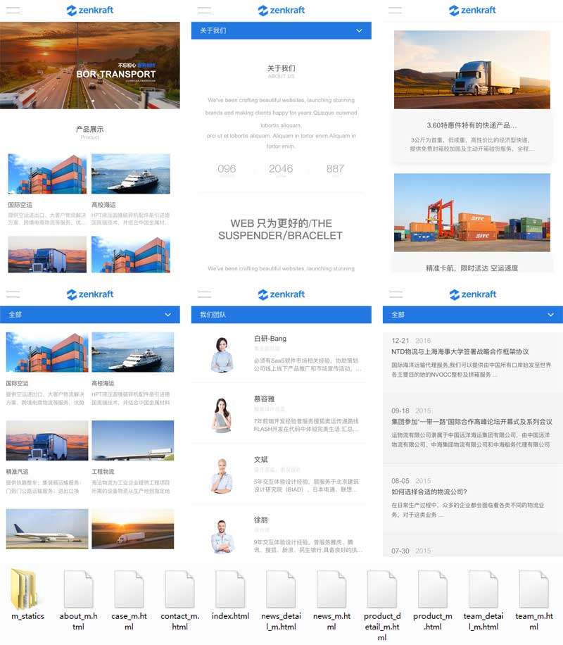 蓝色大气的物流运输公司手机模板,适用于轮船运输、汽车运输、航空运输等物流货运公司手机网站。主要有:首页、产品页,内容页,新闻页,关于我们、联系我们、团队成员页、案例页等总共10个页面。...