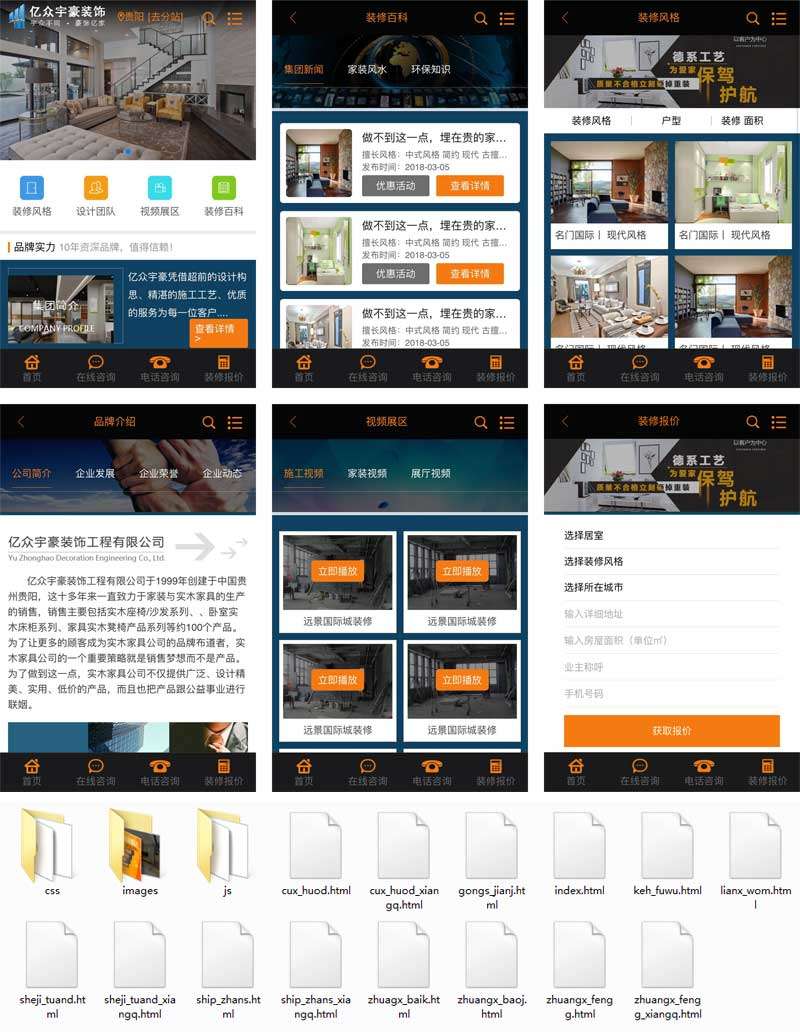 实用的装修装饰企业网站手机模板,手机版装修工程公司网站模板。主要页面有:品牌介绍、装修风格、设计团队、装修百科、促销活动、客户服务、视频展区、五星工程、联系我们等总共14个页面html下载。...