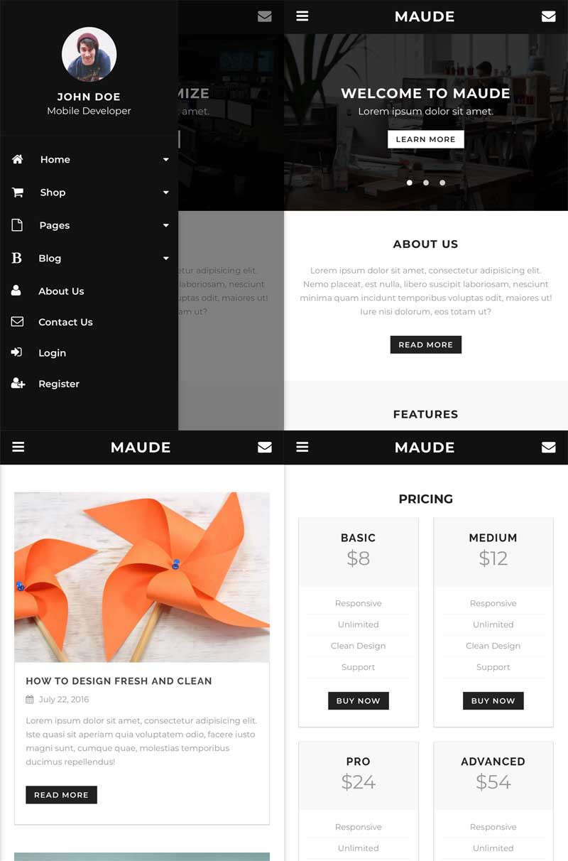Maude移动手机模板适合个人主页,商店,博客类型手机网站模板,简洁的设计,响应式布局、可以轻松定制和修改。...