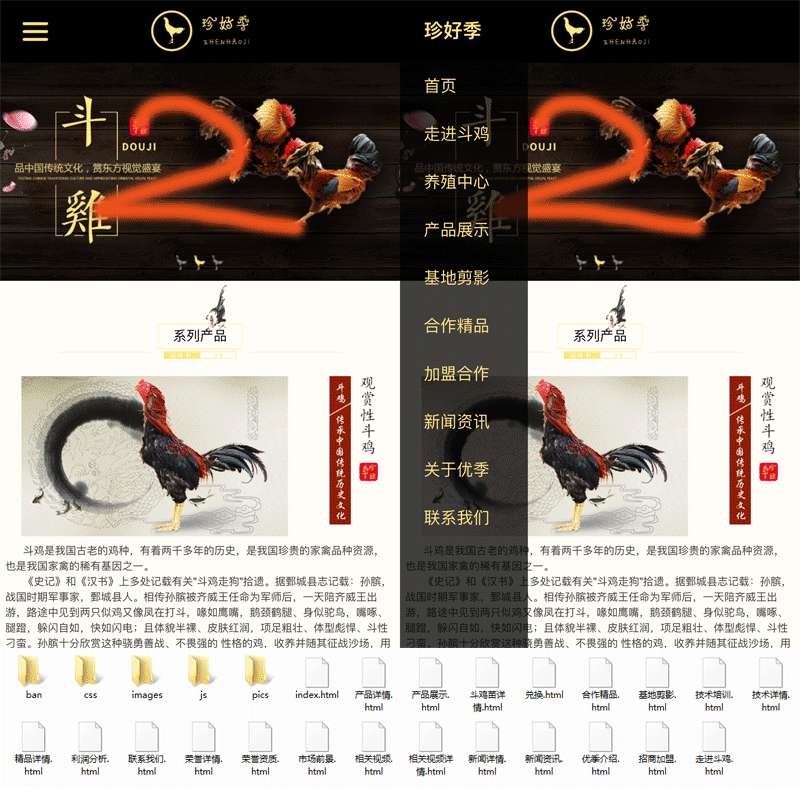养鸡场手机网站、禽类养殖企业网站、产品详情、产品展示、斗鸡苗详情、兑换、合作精品、基地剪影、技术培训、技术详情、精品详情、利润分析、联系我们、荣誉详情、荣誉资质、市场前景、相关视频、相关视频详情、新闻详情、新闻资讯、优季介绍、招商加盟、走...