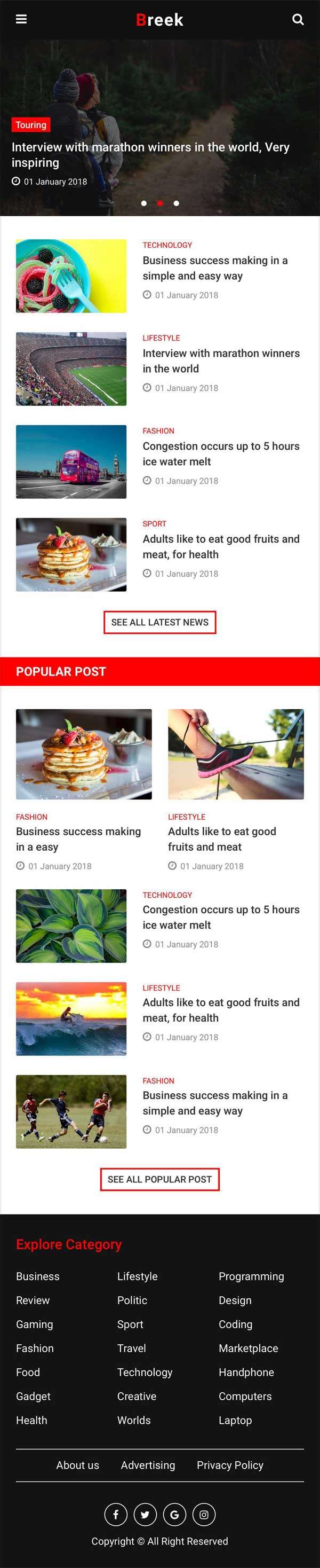 Breek是一款响应式的图片新闻资讯类手机模板,适合新闻,博客等文章类手机网站html整站下载。...