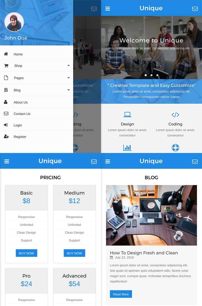 响应式移动端通用模板,有两个主页。许多其他页面,购物,组合,博客等,现代设计布局很容易使用。这个模板很容易编辑,带来干净的设计,现代设计,以及许多其他功能。...