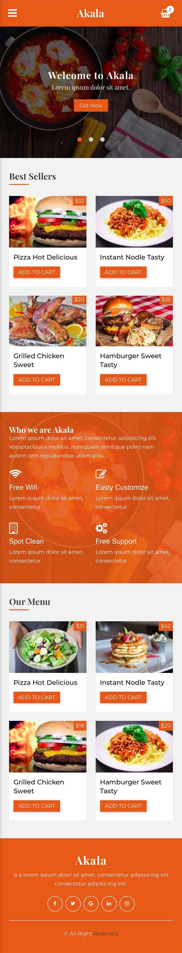 Akala是移动手机端HTML5模板适合餐饮美食、咖啡馆和餐厅网站,有4个创造性的主页,3个商品列表页和4个商品详情和更多的页面。干净的设计,响应迅速、容易定制和更多。和其他许多特性,立即预览可以看到任何功能。...