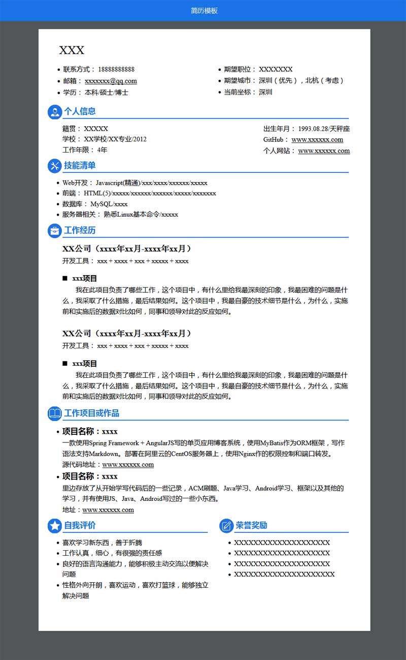 蓝色通用的程序员、web前端开发、网页制作个人简历网页模板html下载。...