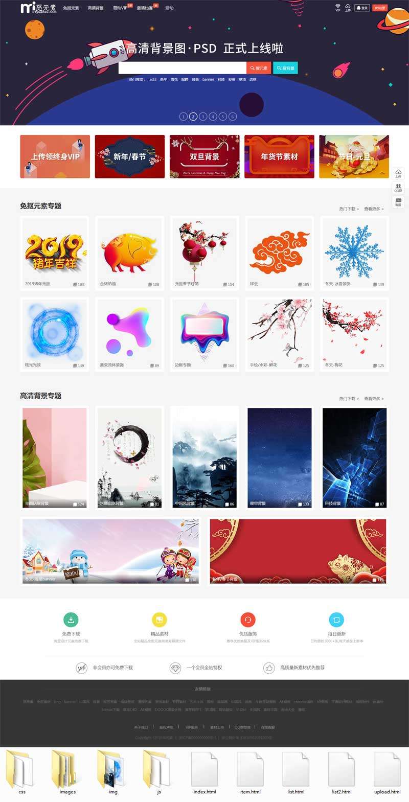 仿某图片元素资源下载素材站模板,免费的设计元素下载网站模板html下载。主要有:首页、列表页、详情页、发布上传页等总共5个页面。...