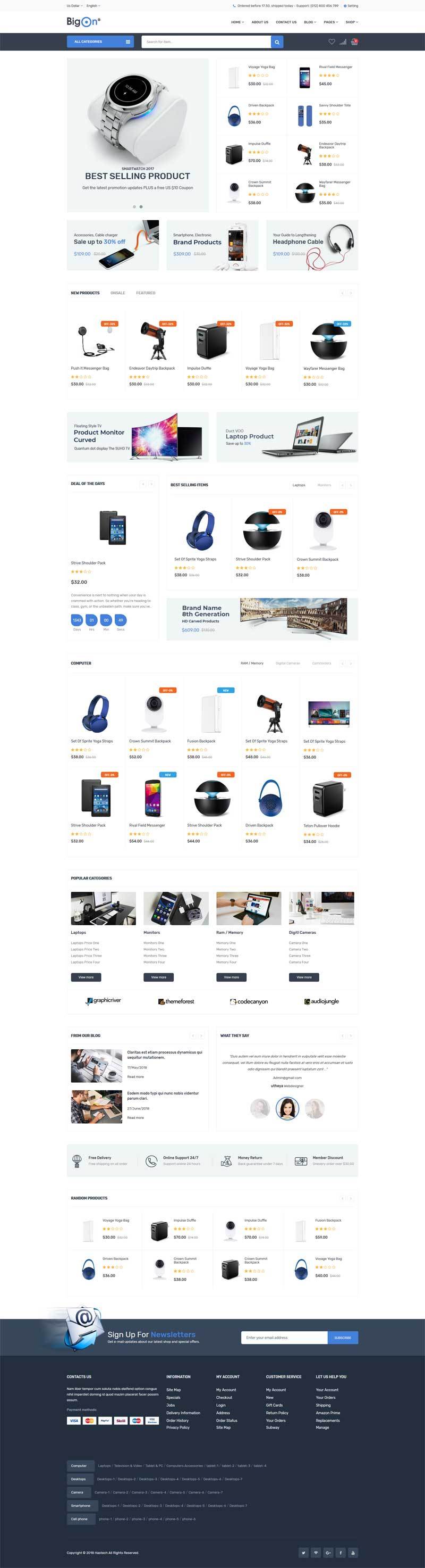 BigOn手机数码电脑商城网站电子商务HTML模板是一个干净和现代商业电子商务平台模板。它提供了4个主页以及商店页面,产品页面、购物车页面,付款页面,列表页面,对比页面和其他几个页面。响应式布局交互式用户友好性和创造性Bigon电子商务HTML模板将创建一个强大...