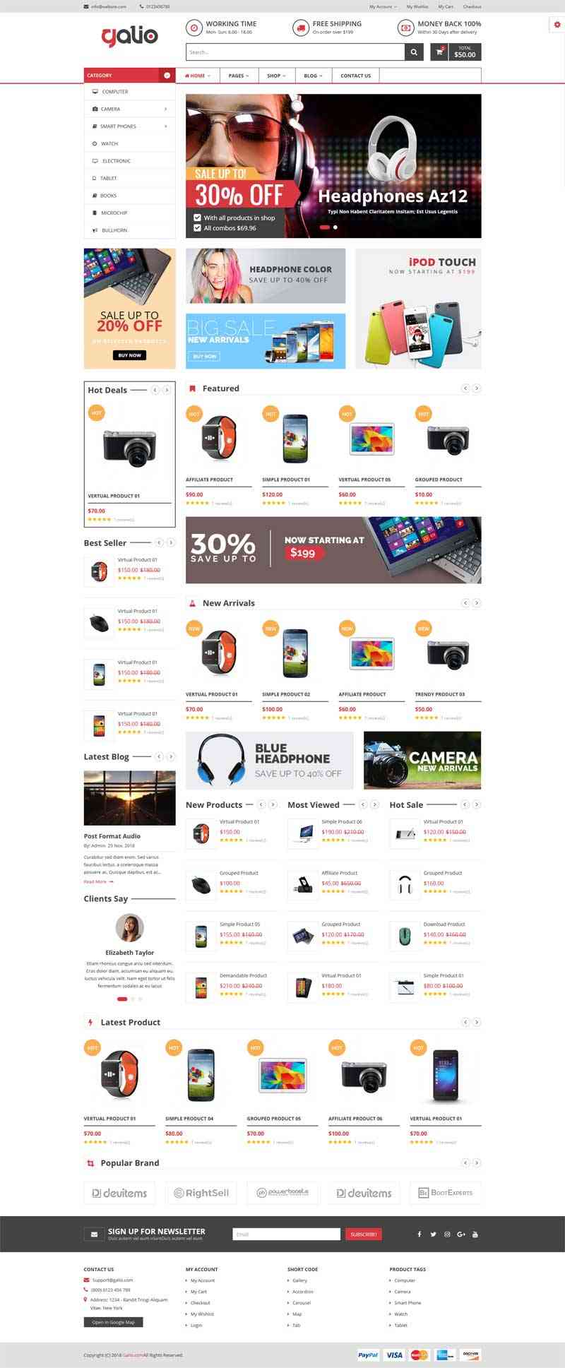 红色大型的电子产品购物商城Bootstrap网站模板。这是基于Bootstrap构建的在线商店销售高科技产品手机、相机、电脑配件、笔记本电脑,耳机,智能手表,iPod,家具,家居装饰,时尚产品等。Galio提供9种商店页面,5种产品详情页面和34个HTML页面。...